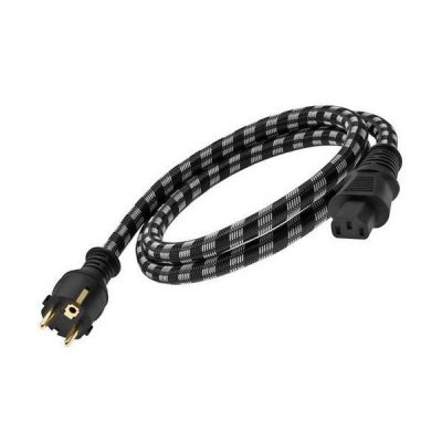 Conducteurs en cuivre hautement désoxygéné (OCC), section de 4 mm² (x3), double blindage et blindage asymétrique, fiches moulées, plusieurs longueurs disponibles, 1 fiche IEC mâle droite / 1 fiche française mâle.